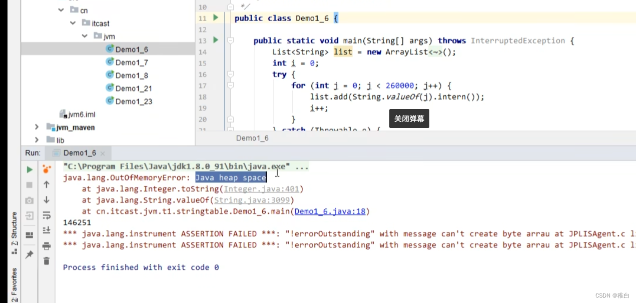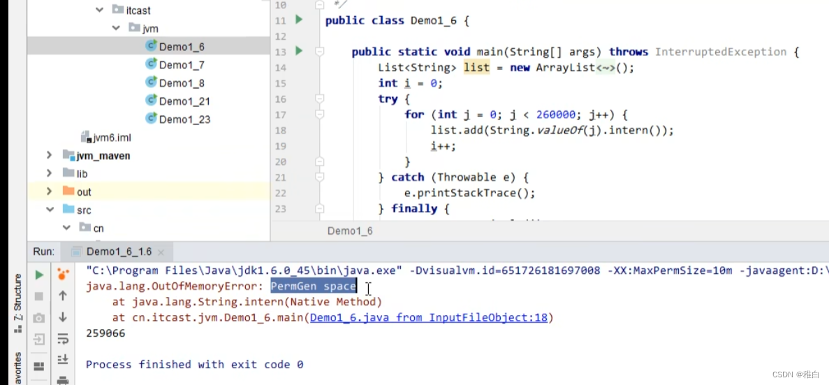 测试:在jvm1.6时,往StringTable中不断存入字符串,最后会报OutOfMemoryError: PermGen Space,即永久代内存溢出了。