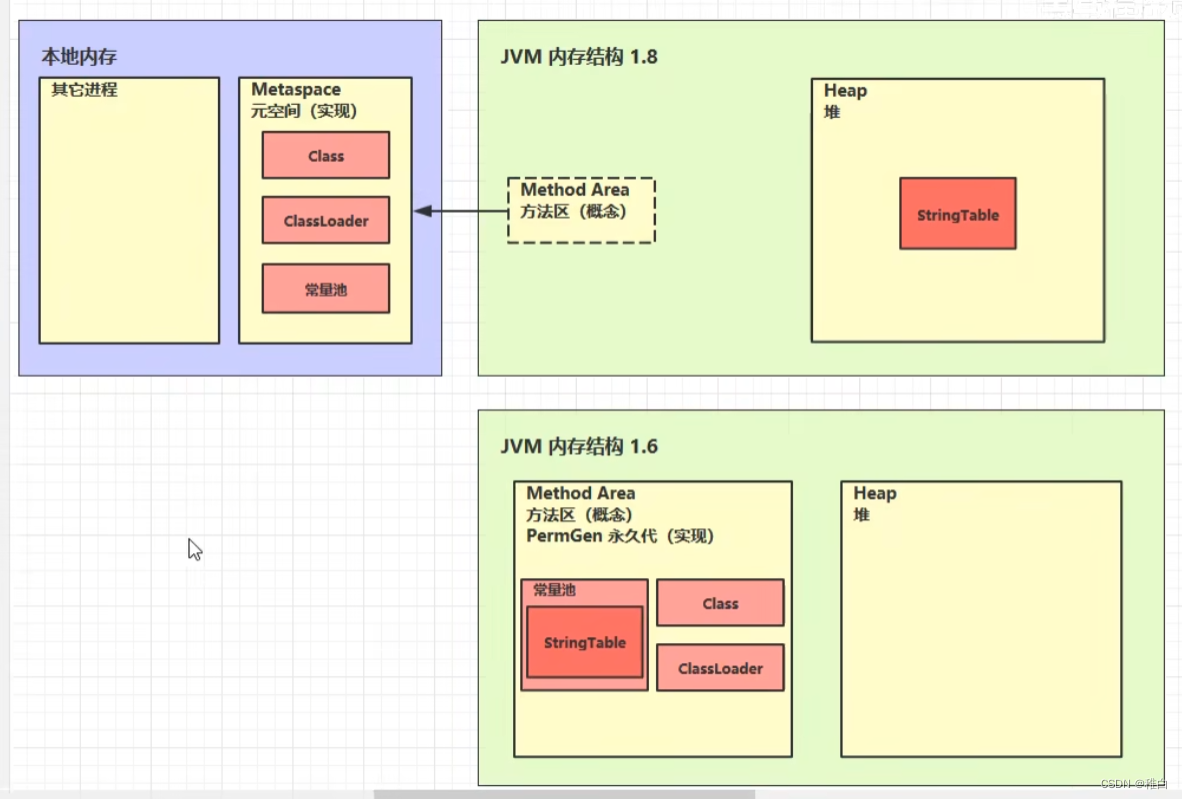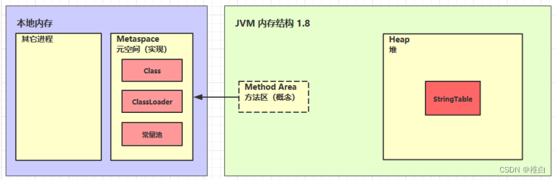 - jvm8之后,方法区的实现发生了变化,被称为“元空间”(Metaspace)。元空间不再是固定大小的,它位于本地内存之中,而不是jvm内存中。它可以根据需要动态扩展,而不会导致OutOfMemoryError。