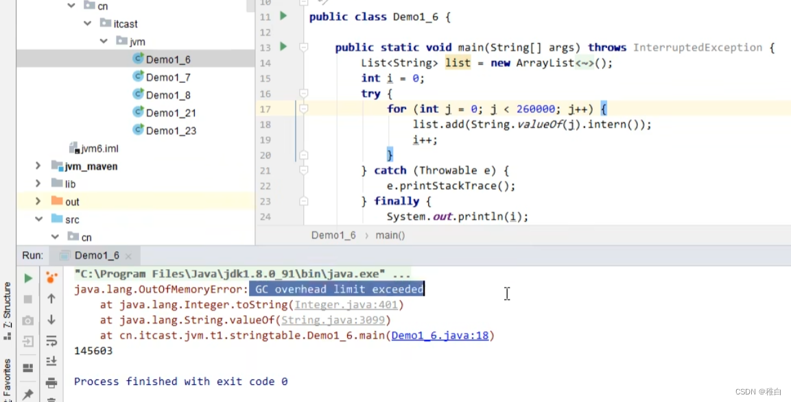 而在jvm1.8时,同样的程序首先会报GC overhead limit exceeded,它表示在一段时间内,JVM花费了过多的时间来执行垃圾回收操作,但仍然无法回收足够的内存空间,导致应用程序无法正常运行。