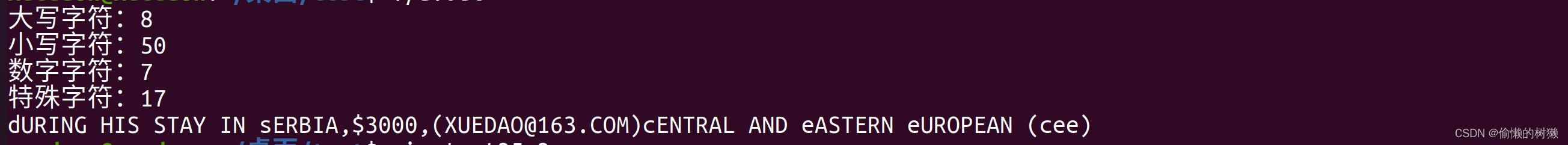 #include <string.h> #include <stdio.h> int main() { int i = 0; int big_count = 0;//大写 int small_count = 0;//小写 int num_count = 0;//数字 int other_count = 0;//特殊字符 char arr[1000] = "During his stay in Serbia,$3000,(xuedao@163.com)Central and Eastern European (CEE)"; //不能用char str ,最多只能含有4个字符 //不能用char * str,不能改变大小写 while( arr[i] != '\0' ) { //大写时-------------------------------------- if((arr[i]>='A') && (arr[i]<='Z')) { arr[i] += 32; big_count++; // printf("%c",arr[i]); } //小写时----------------------------------- else if((arr[i]>='a') && (arr[i]<='z')) { arr[i] -= 32; //ascill码转换大小写 small_count++; // printf("%c",arr[i]); } //数字---------------------------------------- else if((arr[i]>='0') && (arr[i]<='9')) { num_count++; } //特殊字符---------------------------------- else { other_count++; } i++; } printf("大写字符:%d\n",big_count); printf("小写字符:%d\n",small_count); printf("数字字符:%d\n",num_count); printf("特殊字符:%d\n",other_count); printf("%s\n",arr);