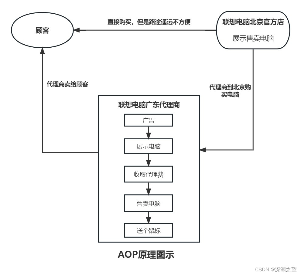 AOP就可以理解为上面的代理商代理联想电脑官方店的过程。联想的官方店(目标对象Target)把展示电脑和销售电脑两个动作(连接点Joinpoint)交给代理商(切面Aspect)接管,代理商在展示电脑和销售电脑两个动作(切入点Pointcut)前后又增加了其他动作(通知/增强 Advice),从而实现代理联想电脑(代理 Proxy),从而实现代理商的更多服务(织入 Weaving)。
