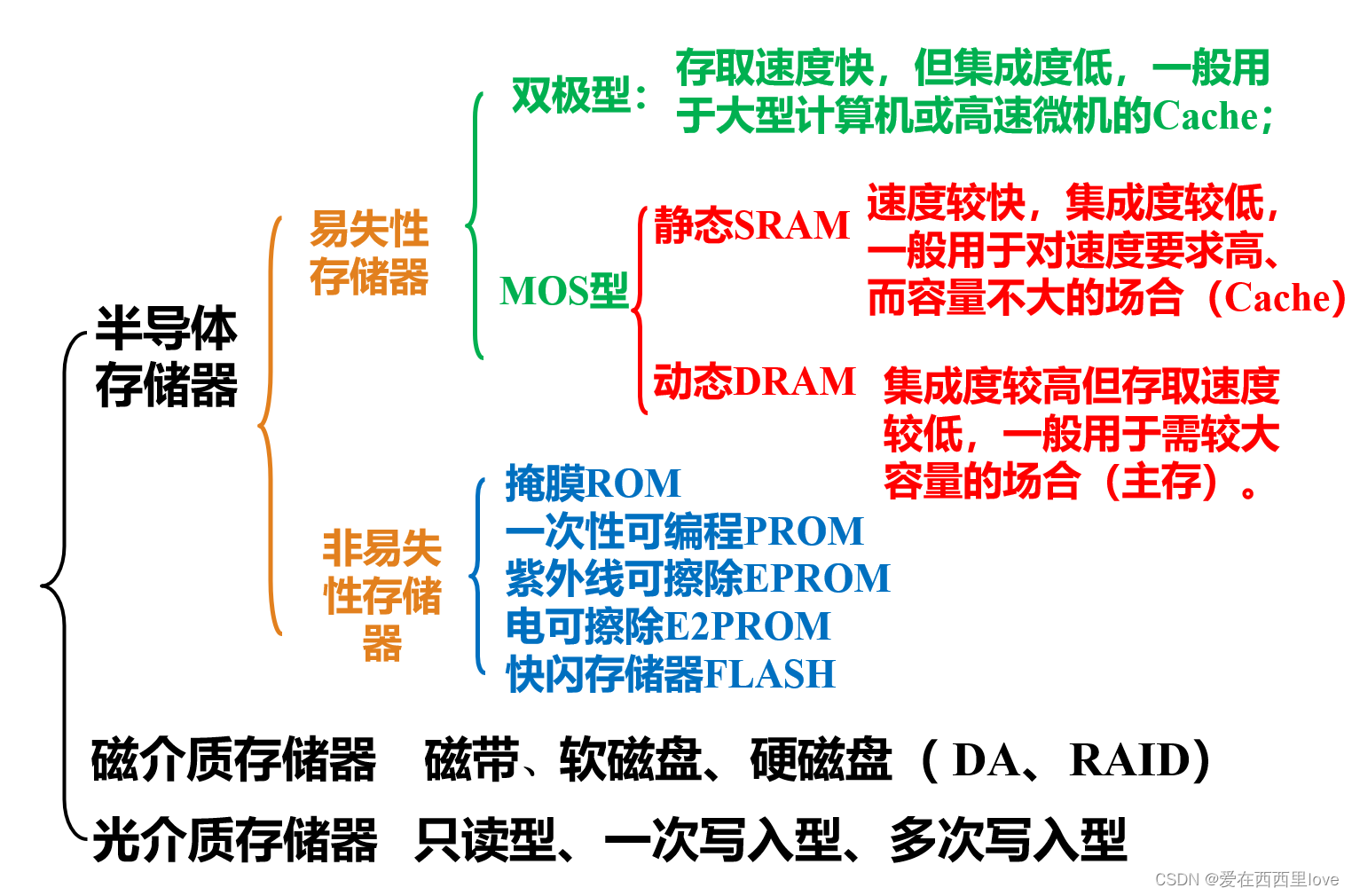 3. 半导体存储器速度快,但成本较高,适合存放少量频繁使用的数据。根据掉电以后存储器中的内容会不会丢失,半导体存储器件可以分为易失性(随机存取存储器,RAM)和非易失性(只读存储器,ROM)。