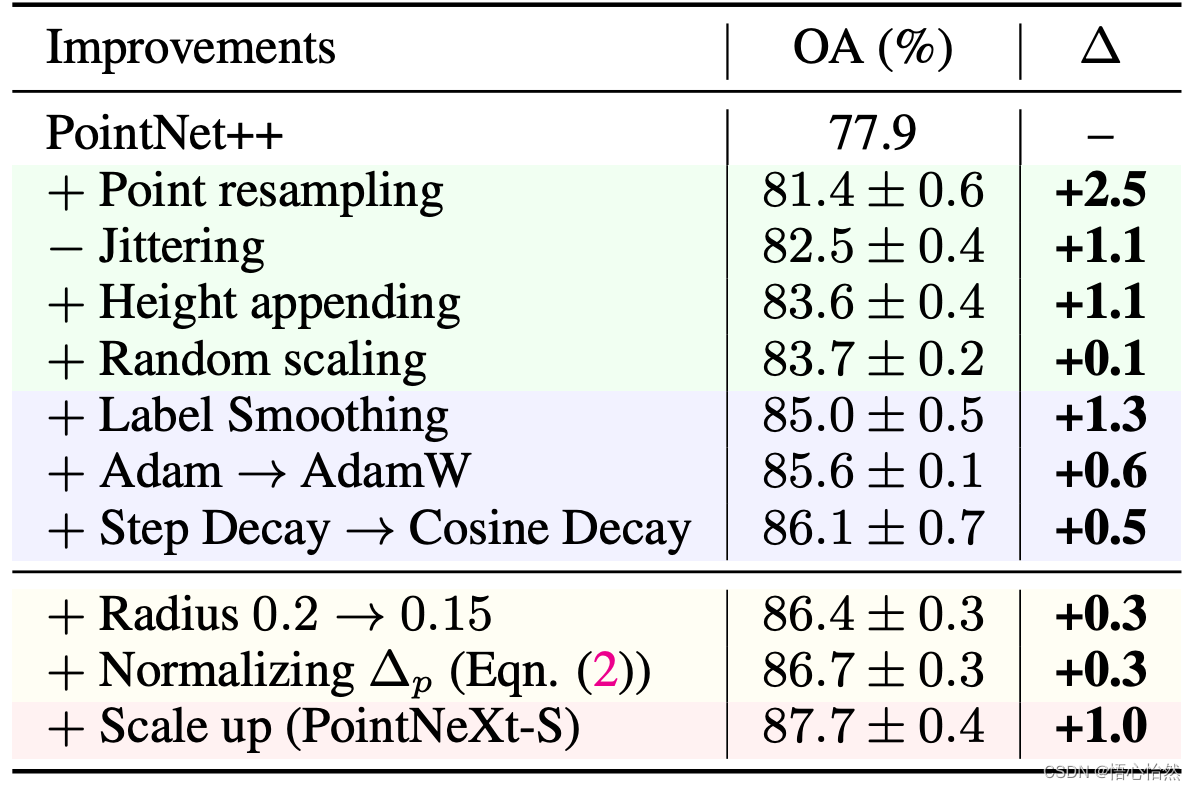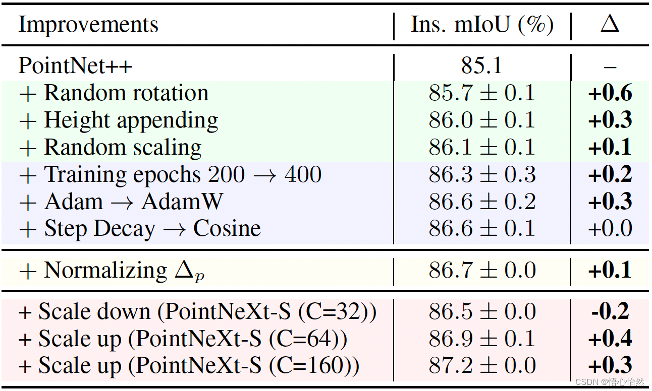 - 表五 S3DIS 分割数据集上按顺序应用训练和缩放策略的叠加实验。我们使用浅绿色、紫色、黄色和粉色背景颜色分别表示数据增强、优化技术、感受野缩放和模型缩放。