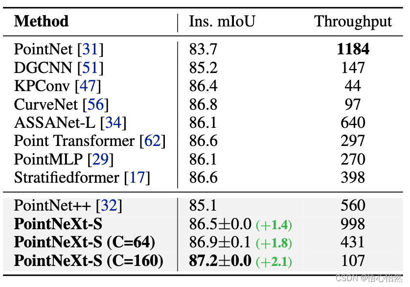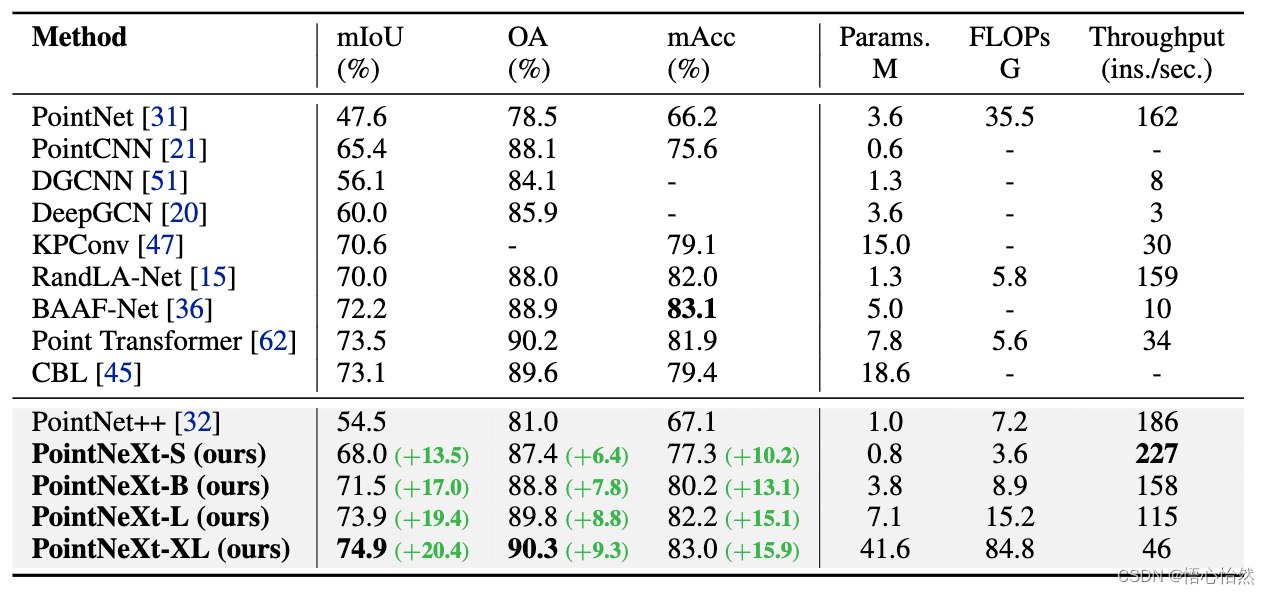 - 表一 S3DIS数据集上语意分割的结果(6-fold交叉验证)。 PointNeXt相较于PointNet++的提升用绿色标注了出来。