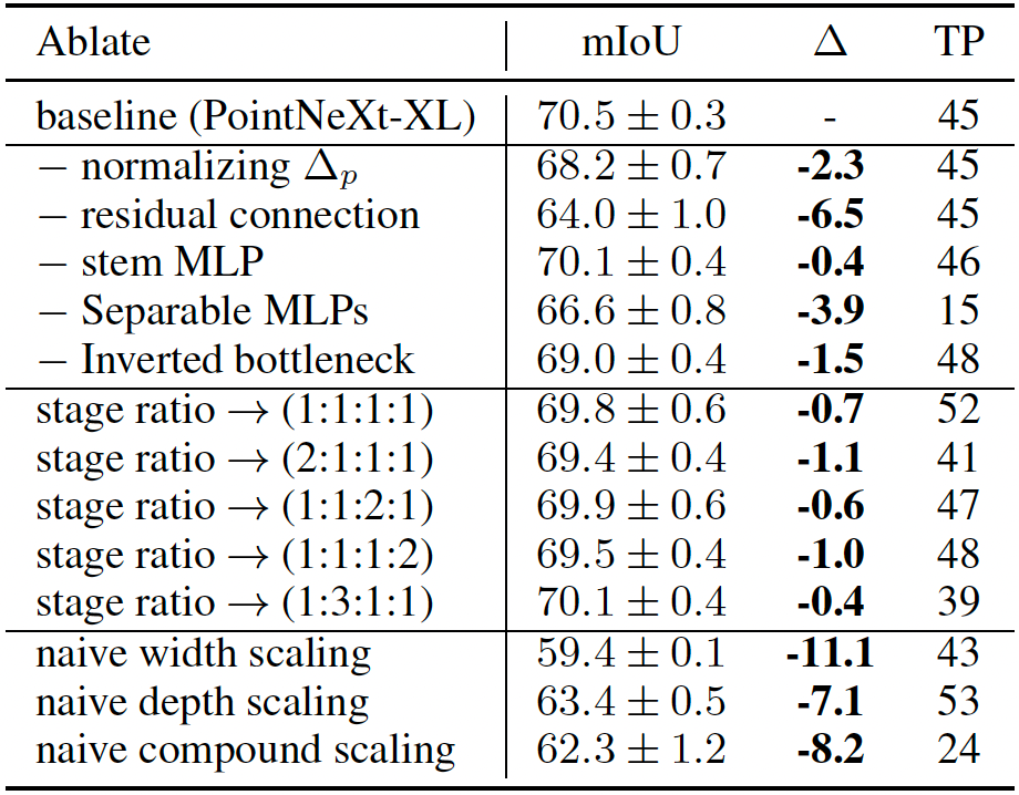 - 我们使用性能最佳的模型 PointNeXt-XL 作为基线,对模型缩放进行了消融实验。我们在S3DIS Area 5上研究了InvResMLP的每个组件以及stage ratio对性能的影响。同时,我们对比了navide scaling的性能。