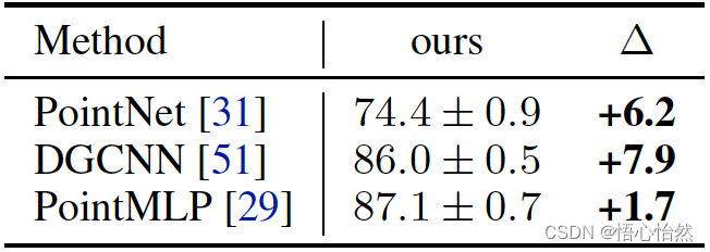 - 此外,如表七所示,我们还将训练策略运用到了不同的神经网络上,对训练策略的可泛化性进行了实验。我们发现了改进训练策略的可泛化性。我们的训练策略可以被用在其他算法,例如PointNet[1],DGCNN[9],以及PointMLP[17]上,并显著提升他们在ScanObjectNN分类任务上的效果。