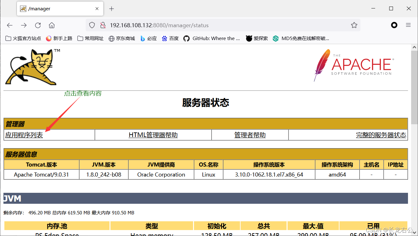 成功登录到管理员界面192.168.187.129:8080/manager,点击应用程序列表