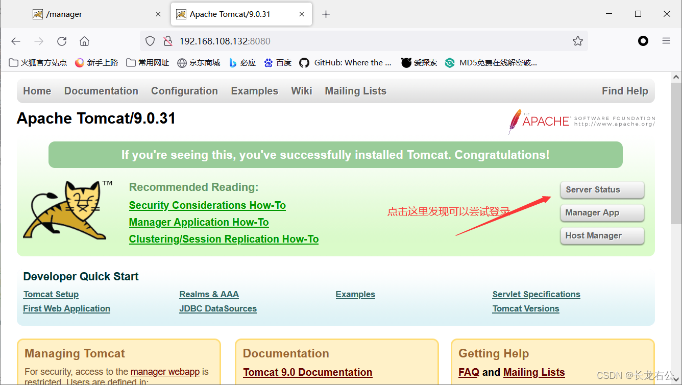 tomcat的默认用户名密码是tomcat和tomcat,尝试登录