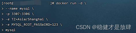 这里是做一个主机--->容器的端口绑定,我这里因为主机在跑着一个mysql,3306被占了,所以我用了3307和容器中的3306绑定,也就是说我们可以在外部通过3307端口,连到容器内的mysql
