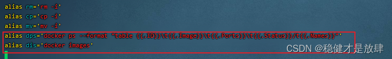 alias dps='docker ps --format "table {{.ID}}\t{{.Image}}\t{{.Ports}}\t{{.Status}}/t{{.Names}}"'