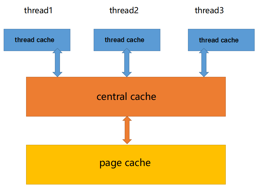 当thread_cache里面没有内存了,就去下一层central_cache里面拿,在没有就再去下一层page_cache里面拿,在没有,就去操作系统里面拿。