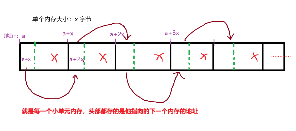 最后一个技巧: 就是如何访问他的头几个字节 来填入下一个单元的首地址 难点就是 指针大小和系统有关 可能4 可能8字节