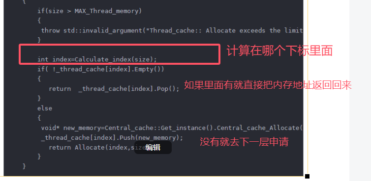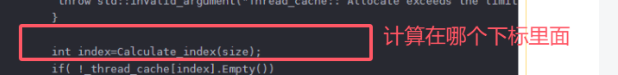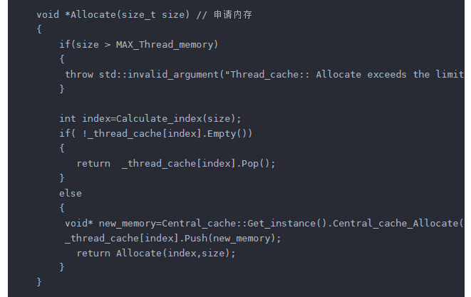 然后就是申请内存的函数了 Allocate 里面的MAX_Thread_memory 就是上面提到的258kb 因为我们设计的初衷就是 小于256kb的才在里面申请 所以用一个 抛异常的方式 来判断 这里设计为变量的形式(相当于用宏吧 但是不推荐) 就是方便后面你要改这个大小的话 直接在外面一个地方改就行 里面所有地方就都跟着改了哈
