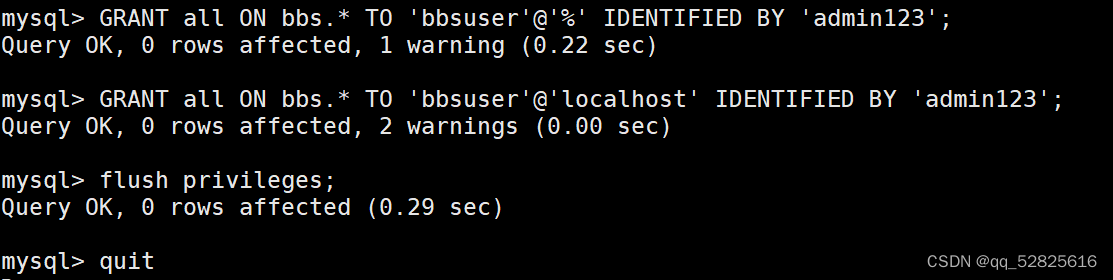 GRANT all ON bbs.* TO 'bbsuser'@'localhost' IDENTIFIED BY 'admin123';