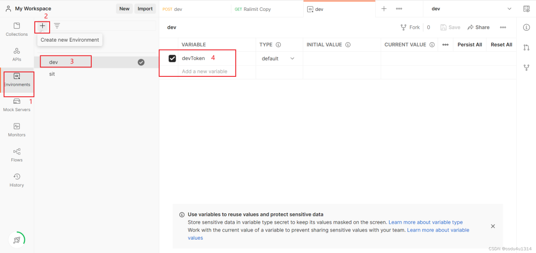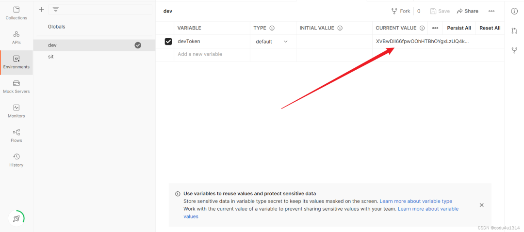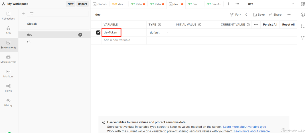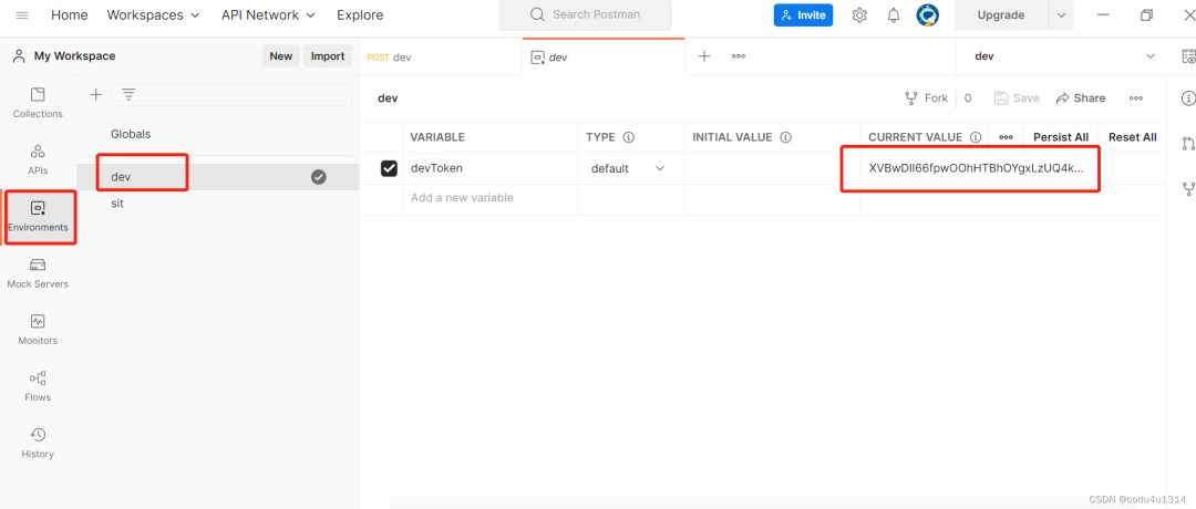 在postman中新增一个环境变量devToken,将上一步获取到的token赋值给devToken;