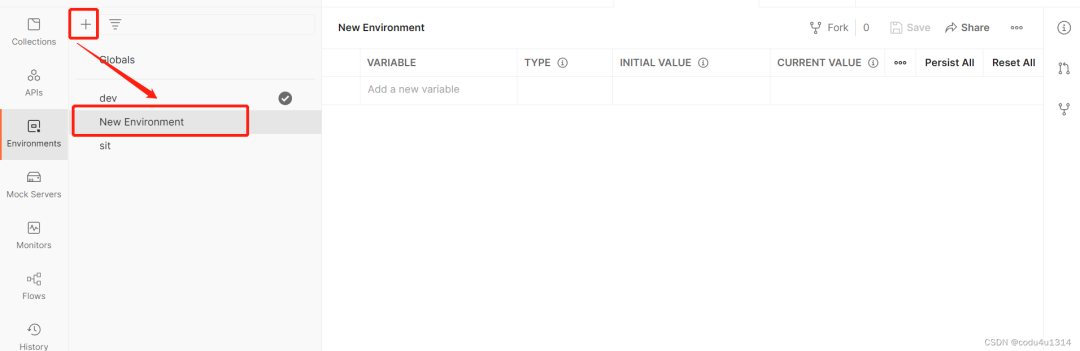 Globals区域一般用来存储不会随环境变化的参数,而token一般会随环境变化,所以我们还是新建environment参数,点击 “+”:
