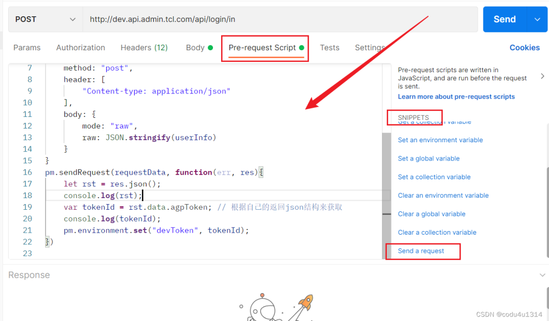 这个区域同样有很多的脚本语言可以参考,具体看右侧,此处按下不表,我们在该请求的pre-request script区域里加上以上脚本: