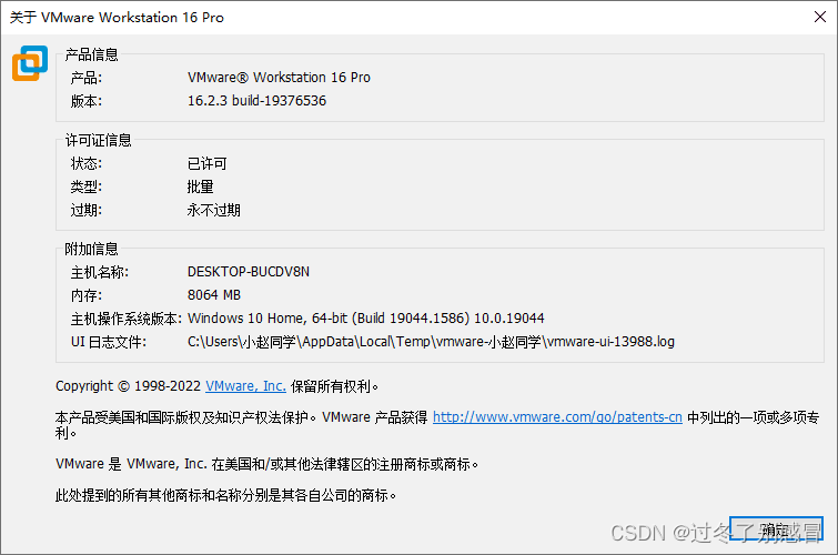 安装后可能要求重启系统,重启后进入软件。依次点击导航栏中的 帮助 -> 关于 VMware Workstation ,查看许可证信息的状态,如下图所示即为激活成功。