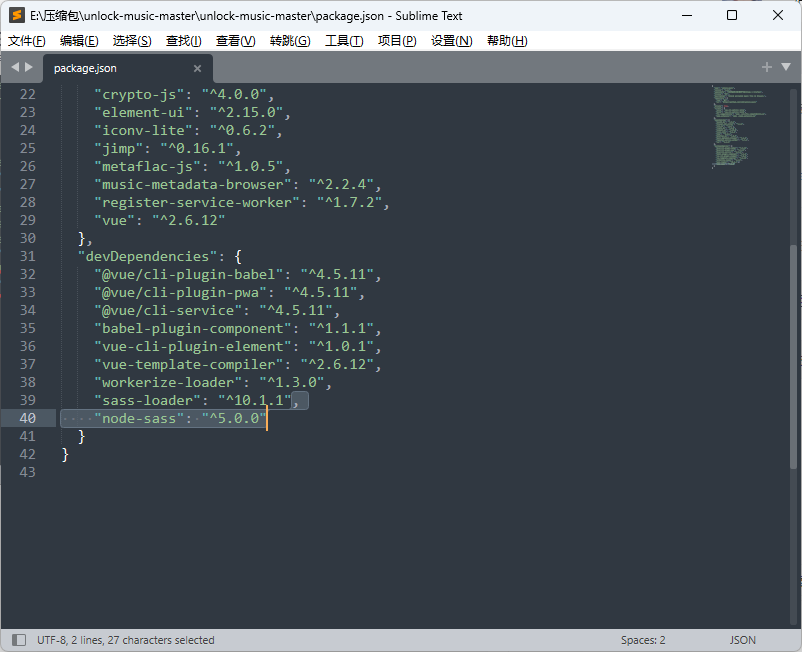 2.记事本打开package.json,找到node-sass删除,注意保持json格式,上面的小,点也要删除