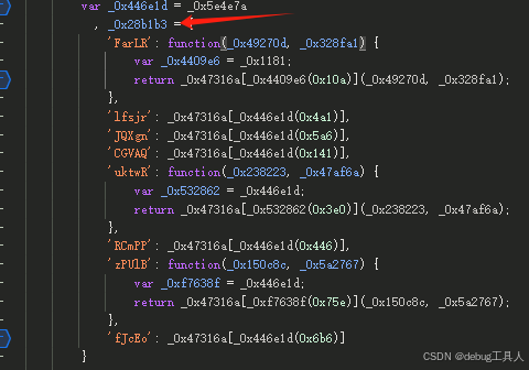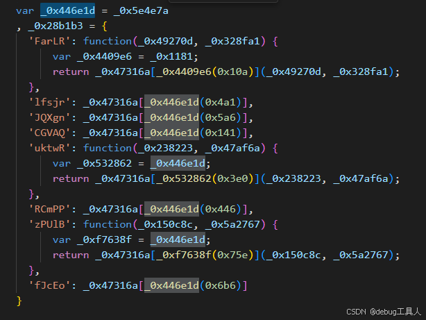 先看【_0x5e4e7a】点进去发现和第一个解密的函数相同,而且看主函数明文数据,调用这个function只用到了 其中的几个标签 JQxgn,lfsjr,farlr, 那么这个function已经解密(唯一一个需要解密的和溯源加密函数1相同)