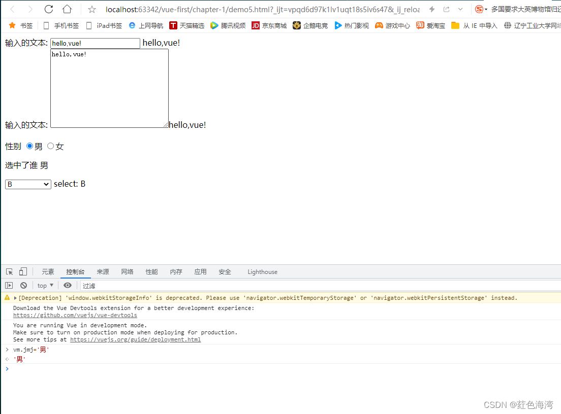 性别 <input type="radio" name="sex" value="男" v-model="jmj" >男