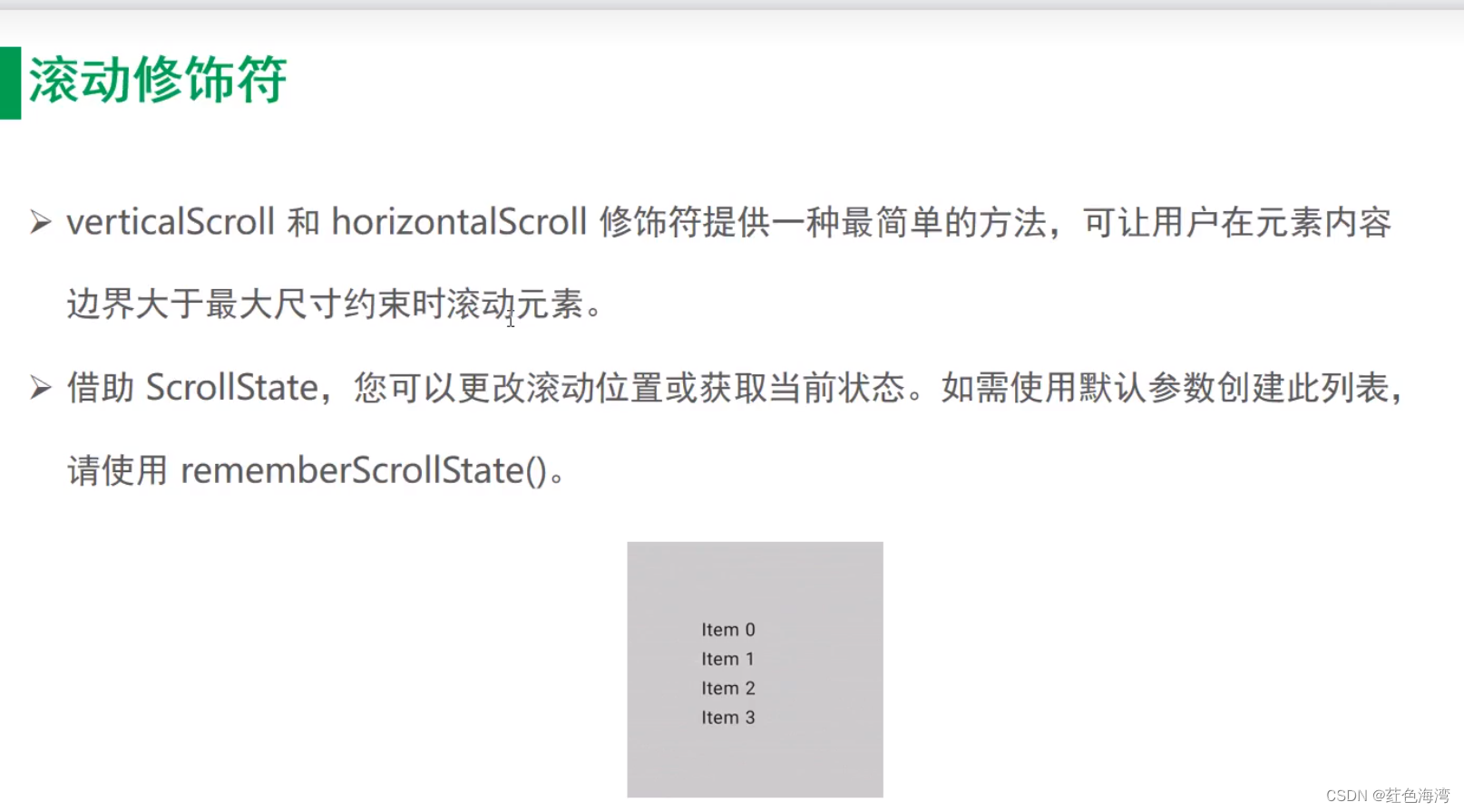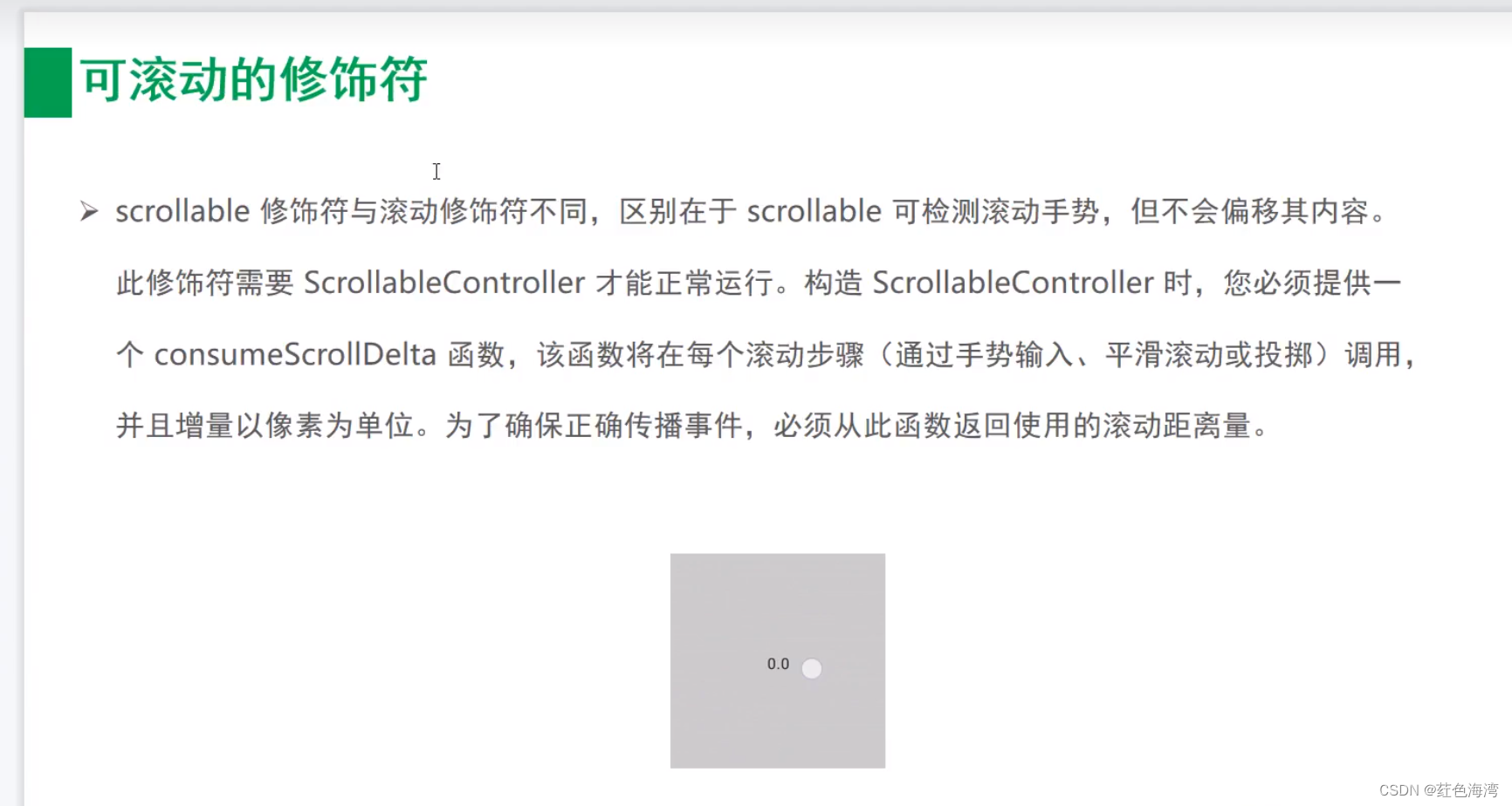 //scrollable 修饰符与滚动修饰符不同,区别在于scrollable 可检测滚动手势,但不会便宜其内容.