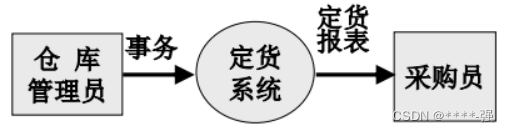 • 零件入库或出库称作事务,仓库管理员通过仓库的终端把事务报告给订货系统。当某种零件的库存少于库存量临界值时就应该再次订货了。