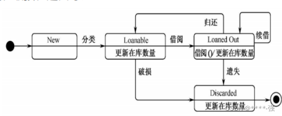 图书馆系统里的图书主要有这几种状态:新上、可借阅、已借出、已丢弃这四种状态,触发这些状态进行转换的事件有分类、借阅、归还、续借、破损、遗失等。