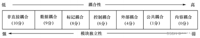 (2)耦合:是模块之间互相连接的紧密程度的度量。其强弱取决于模块间接口的复杂程度、进入或访问一个模块的点以及通过接口的数据。