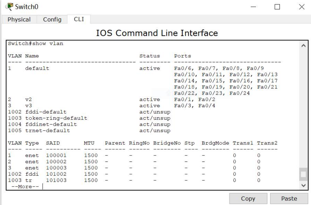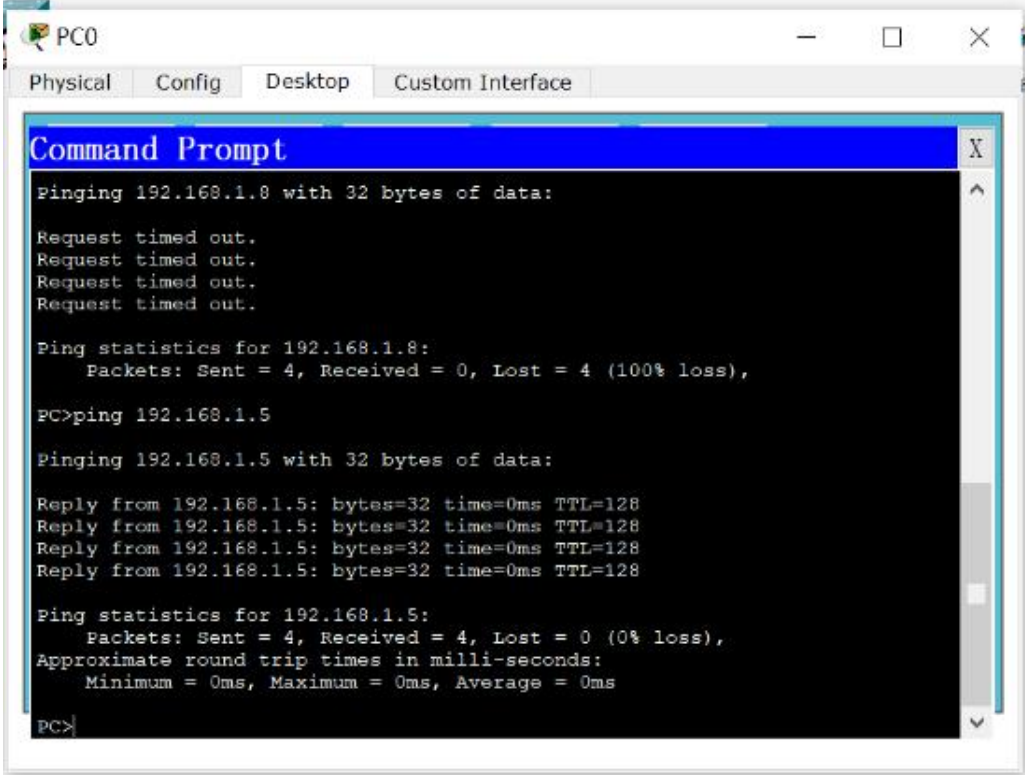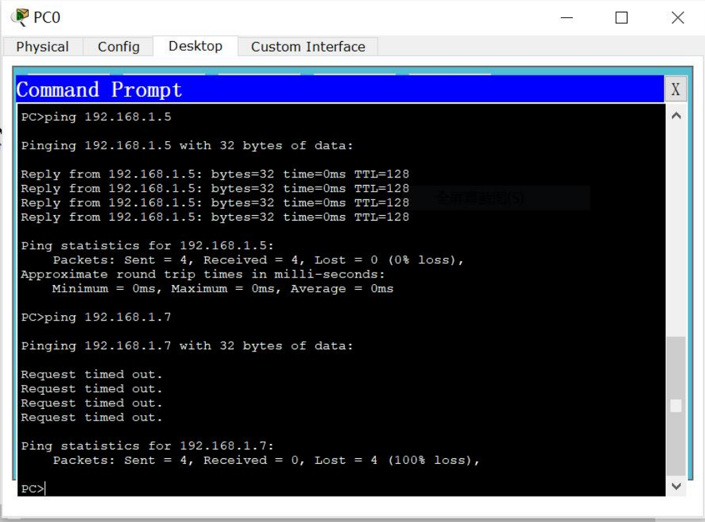 用 ip 地址为 192.168.1.1 的主机(PC0)向同一 vlan(v2)下的 192.168.1.5 主机(PC4)发包,发 现可以互通
