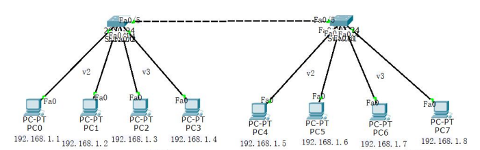然后设置交换机 fa 0/5 口为 trunk 模式,使得不同交换机同一 vlan 下 PC 可以互连