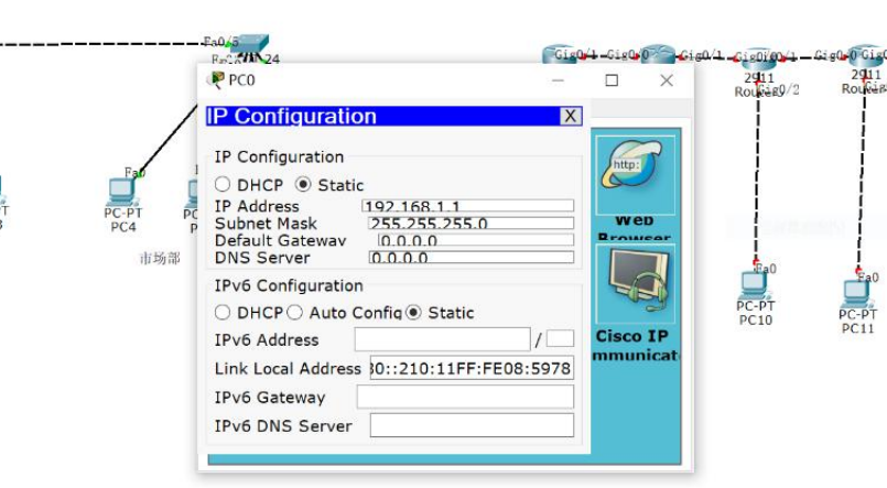 设置 pc 默认网关为 pc 所连接的路由器接口的网络地址(注意主机的网络地址和所连端口 的网络号是一致的)