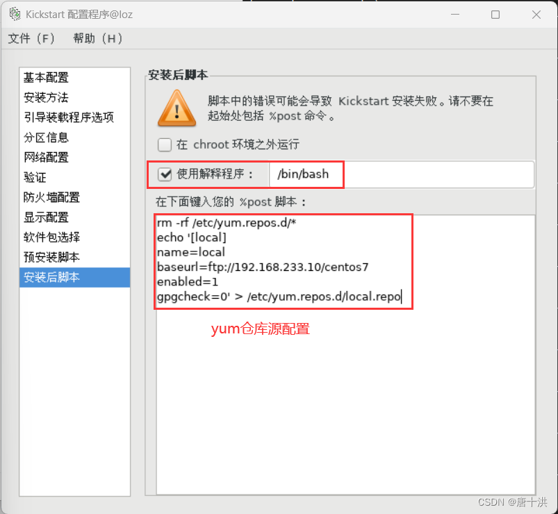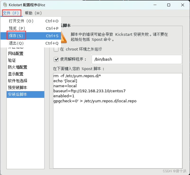 仓库源配置的代码:rm -rf /etc/yum.repos.d/* echo '[local] name=local baseurl=ftp://192.168.233.10/centos7 # 记得改IP地址 enabled=1 gpgcheck=0' > /etc/yum.repos.d/local.repo - 保存文件到指定位置