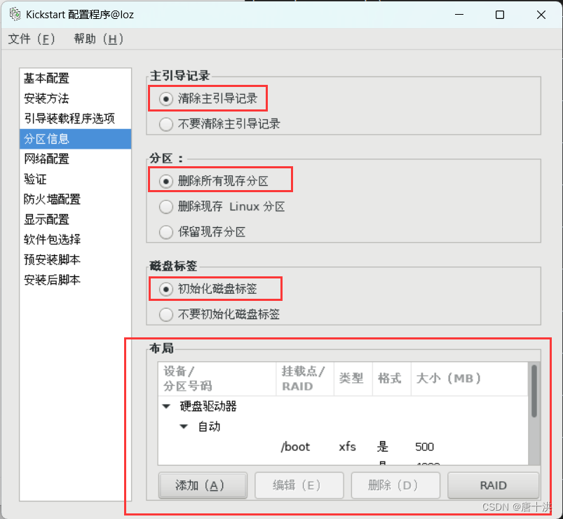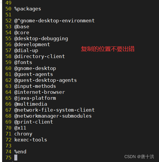 可以根据需要将/root/anaconda-ks.cfg 的软件包安装脚本复制到 ks.cfg文件中,