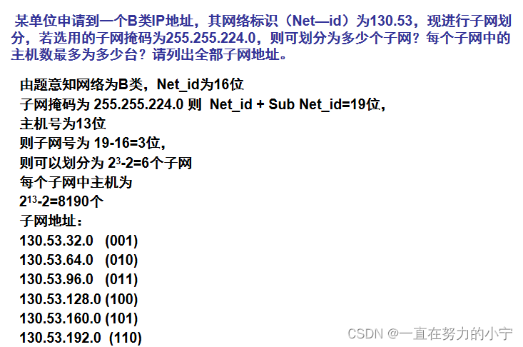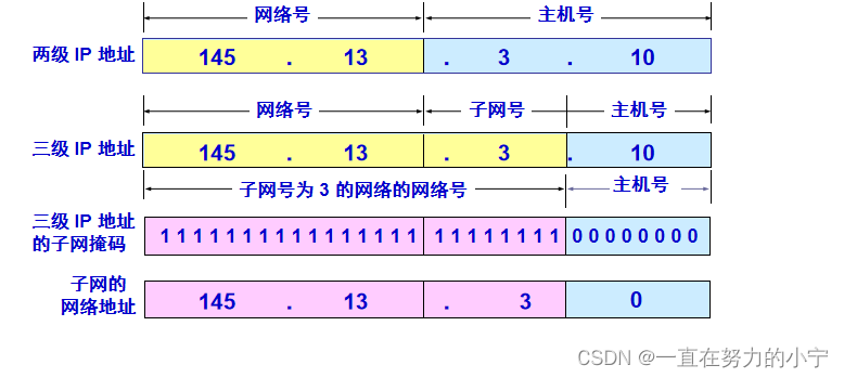 当没有划分子网时,IP 地址是两级结构。 划分子网后 IP 地址就变成了三级结构。 划分子网只是把 IP 地址的主机号 host-id 这部分进行再划分,而不改变 IP 地址原来的网络号 net-id。