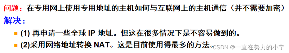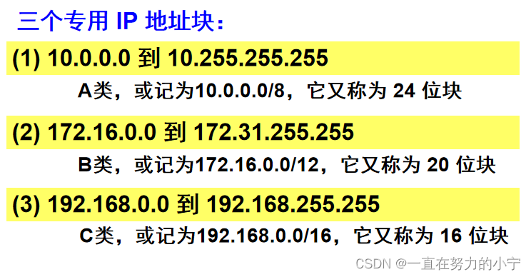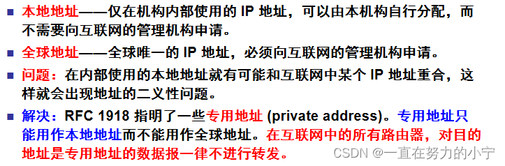 采用这样的专用 IP 地址的互连网络称为专用互联网或本地互联网,或更简单些,就叫做专用网。 因为这些专用地址仅在本机构内部使用。专用IP地址也叫做可重用地址 (reusable address)。