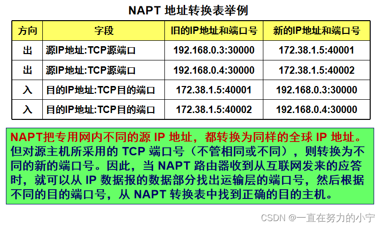 使用端口号的 NAT 叫做网络地址与端口号转换NAPT (Network Address and Port Translation),而不使用端口号的 NAT 就叫做传统的 NAT (traditional NAT)。