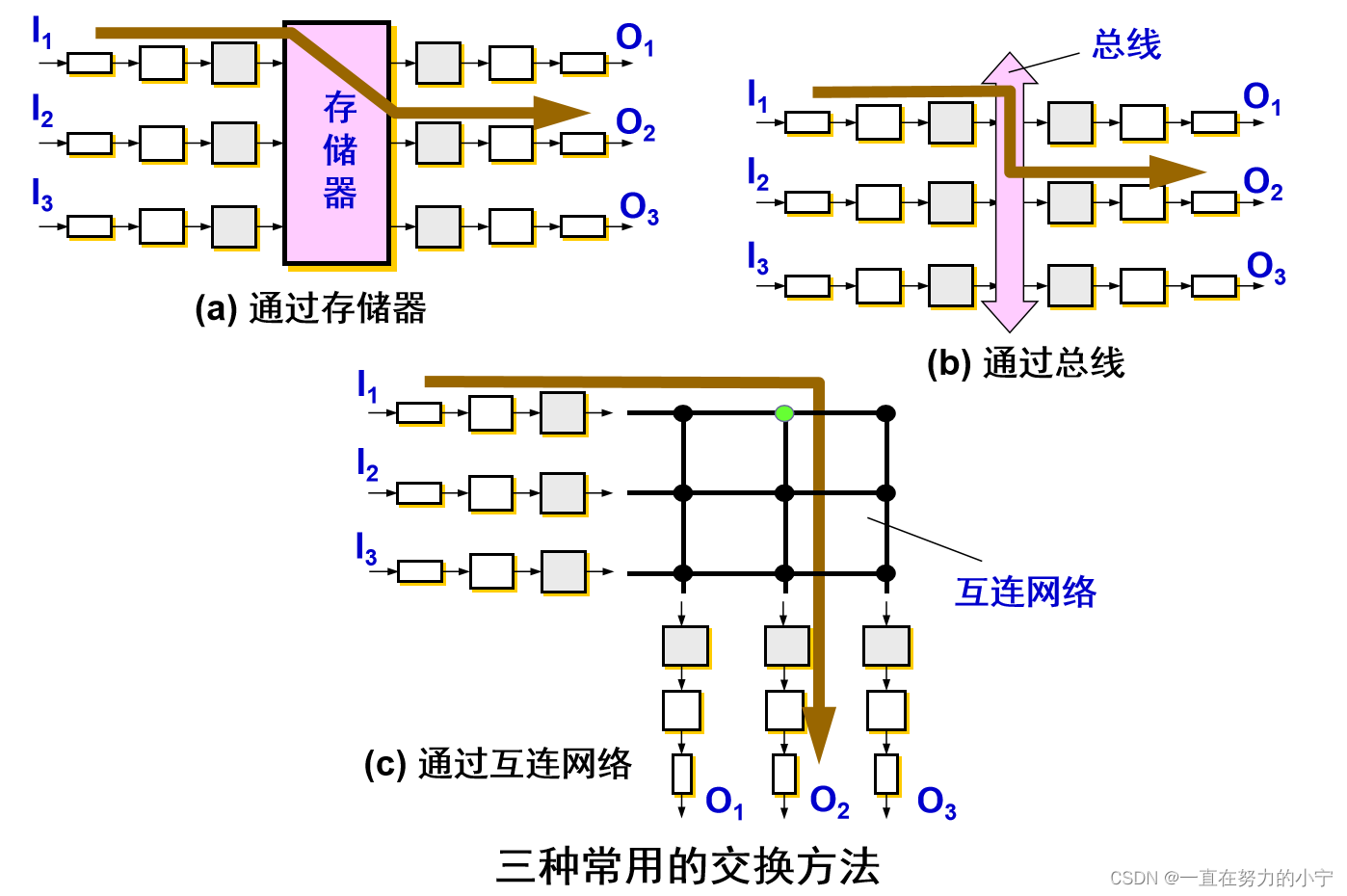 交换结构是路由器的关键构件。 正是这个交换结构把分组从一个输入端口转移到某个合适的输出端口。 实现交换有多种方法。常用交换方法有三种: 通过存储器、通过总线、通过纵横交换结构