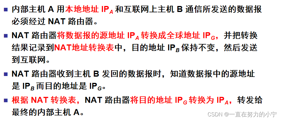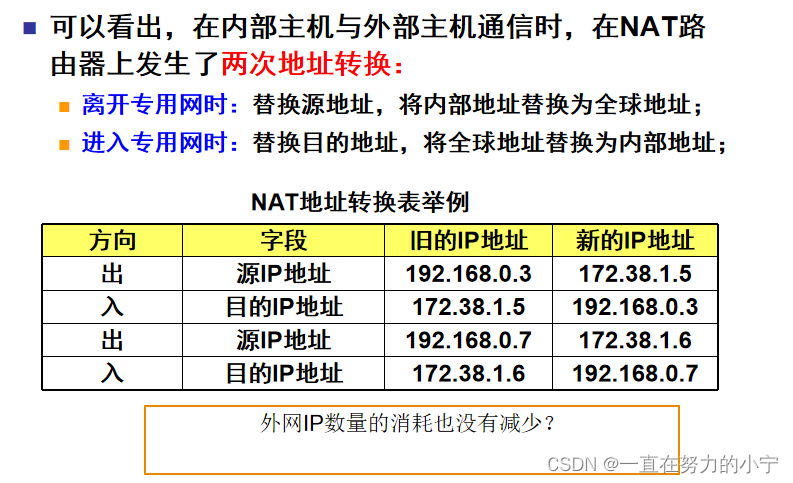 当 NAT 路由器具有 n 个全球 IP 地址时,专用网内最多可以同时有 n 台主机接入到互联网。这样就可以使专用网内较多数量的主机,轮流使用 NAT 路由器有限数量的全球 IP 地址。