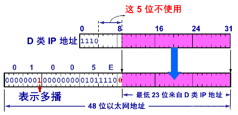 D 类 IP 地址可供分配的有 28 位,在这 28 位中的前 5 位不能用来构成以太网硬件地址。