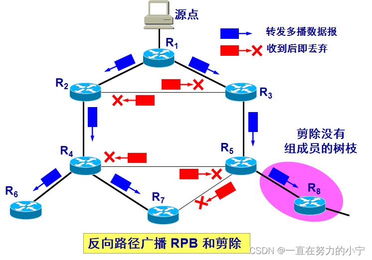 (1) 洪泛与剪除 : 这种方法适合于较小的多播组,而所有的组成员接入的局域网也是相邻接的。 一开始,路由器转发多播数据报使用洪泛的方法(这就是广播),为了避免兜圈子,采用了叫做反向路径广播 RPB (Reverse Path Broadcasting) 的策略。