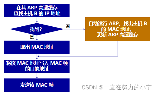 当主机 A 欲向本局域网上的某个主机 B 发送 IP 数据报时,就先在其 ARP 高速缓存中查看有无主机 B 的 IP 地址。 如有,就可查出其对应的硬件地址,再将此硬件地址写入 MAC 帧,然后通过局域网将该 MAC 帧发往此硬件地址。 如没有, ARP 进程在本局域网上广播发送一个 ARP 请求分组。收到 ARP 响应分组后,将得到的 IP 地址到硬件地址的映射写入 ARP 高速缓存。