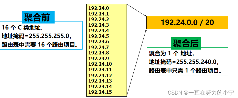 一个 CIDR 地址块可以表示很多地址,这种地址的聚合常称为路由聚合,它使得路由表中的一个项目可以表示很多个(例如上千个)原来传统分类地址的路由。