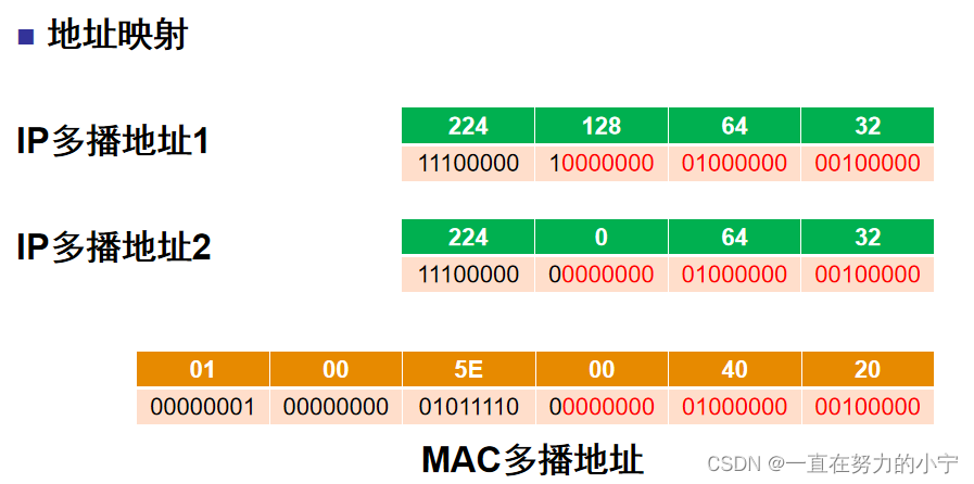 互联网号码指派管理局 IANA 拥有的以太网地址块的高 24 位为 00-00-5E。