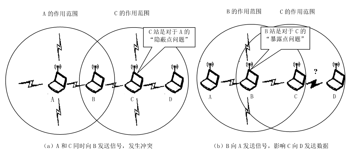 图4-8 (b)则是另一种情况。站B向A发送数据,而C又想和D通信。但C检测到媒体上有信号,于是就不向D发送数据。其实B向A发送数据并不影响C向D发送数据。这就是暴露站点问题(exposed station problem)。