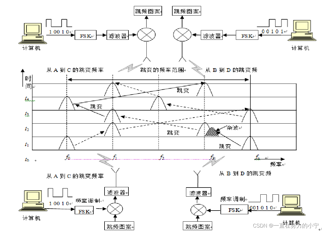 FHSS是一种载频不断随机改变的扩频技术,载频的变化规律受一串伪随机码的控制