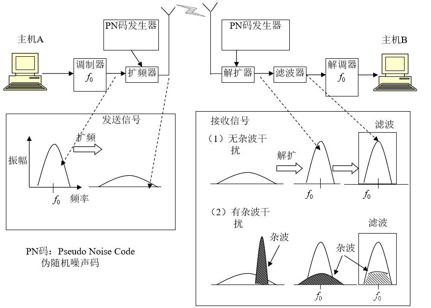 6. 通信安全保密性:直扩系统和跳频系统都具有较强的保密功能。直扩系统的保密功能更强,同时由于信号的谱密度很低,对其它系统的影响就很小。