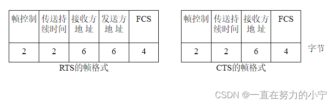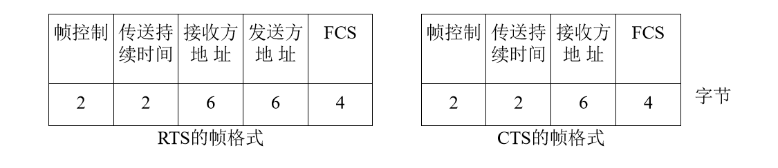在无线LAN中,为了进一步减小在各种环境下的数据碰撞概率,源端与目的端在传送数据之前要交换简短的控制帧,它们是发送请求RTS (Request To Send)和发送响应CTS (Clear To send),RTS和CTS的帧格式如图所示。