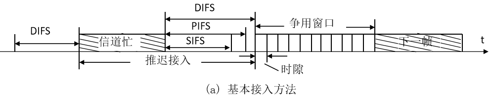 (1) 欲发送帧的站先监听信道。若发现信道空闲,则继续监听一段时间IFS,看信道是否仍为空闲。如是,则立即发送数据。信道已经空闲了还要再等待一段时间的原因是3种不同数值的IFS可将不同类型的数据划分为不同的优先级,IFS值小的优先级高。这样做能够减小冲突的几率。